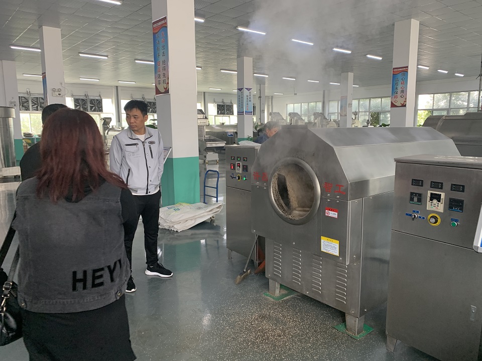 客戶來廠考察試機(jī)流水線電磁炒貨機(jī)炒苦蕎米